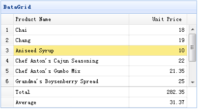 <table id="tt" title="DataGrid" class="easyui-datagrid" style="width:400px;height:250px" url="data/datagrid17_data.json" fitColumns="true" rownumbers="true" showFooter="true"> <thead> <tr> <th field="name" width="80">Product Name</th> <th field="price" width="40" align="right">Unit Price</th> </tr> </thead> </table>