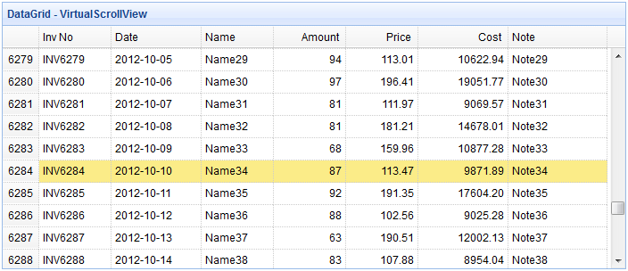 <table id="tt" class="easyui-datagrid" style="width:700px;height:300px" title="DataGrid - VirtualScrollView" data-options="view:scrollview,rownumbers:true,singleSelect:true, url:'datagrid27_getdata.php',autoRowHeight:false,pageSize:50"> <thead> <tr> <th field="inv" width="80">Inv No</th> <th field="date" width="100">Date</th> <th field="name" width="80">Name</th> <th field="amount" width="80" align="right">Amount</th> <th field="price" width="80" align="right">Price</th> <th field="cost" width="100" align="right">Cost</th> <th field="note" width="110">Note</th> </tr> </thead> </table>