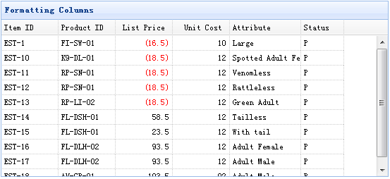 <table id="tt" title="Formatting Columns" class="easyui-datagrid" style="width:550px;height:250px" url="data/datagrid_data.json" singleSelect="true" iconCls="icon-save"> <thead> <tr> <th field="itemid" width="80">Item ID</th> <th field="productid" width="80">Product ID</th> <th field="listprice" width="80" align="right" formatter="formatPrice">List Price</th> <th field="unitcost" width="80" align="right">Unit Cost</th> <th field="attr1" width="100">Attribute</th> <th field="status" width="60" align="center">Stauts</th> </tr> </thead> </table>