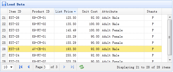 我们定义一些可排序的列,包含 itemid、productid、listprice、unitcost 等等。'attr1' 列和 'status' 列不能排序。