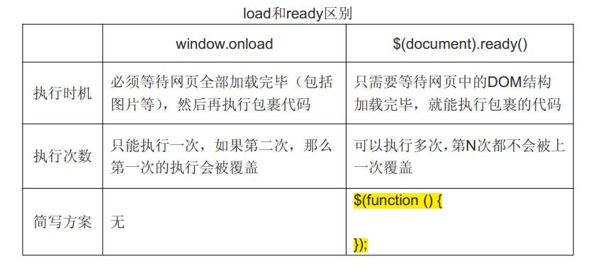 window.onload = function () { // 执行代码 }jQuery 入口函数与 JavaScript 入口函数的区别: