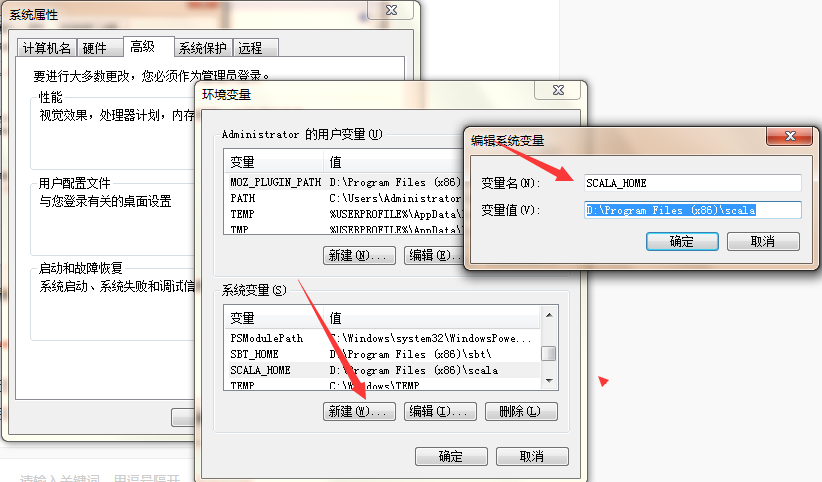 设置 SCALA_HOME 变量:单击新建,在变量名栏输入:SCALA_HOME: 变量值一栏输入:D:\Program Files(x86)\scala 也就是 Scala 的安装目录,根据个人情况有所不同,如果安装在 C 盘,将 D 改成 C 即可。